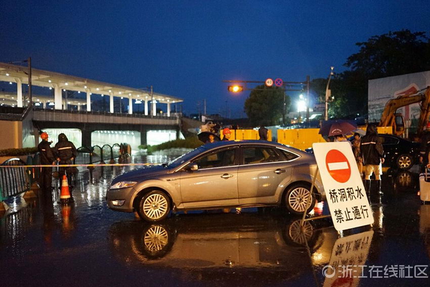 The traffic police set up the warning line around the submerged tunnel. (Photo/ www.zjol.com.cn)