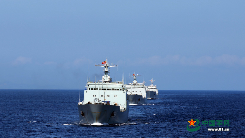 A landing ship division of the South China Sea Fleet, a marine brigade, a navy aviation unit, an amphibious armored force and other units jointly conduct a transportation drill in middle July 2015. (Photo/www.81.cn)