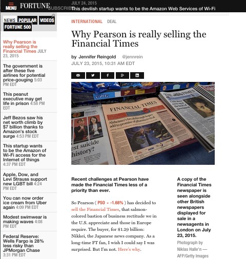 The publishing group Pearson announced that it would be selling the Financial Times, the yellow stained newspaper popular in both the US and Europe. Japanese media firm Nikkei announced they would purchase the Financial Times for $1.3 billion USD. Pearson is reportedly looking to invest more in education, the primary driver of their revenue.