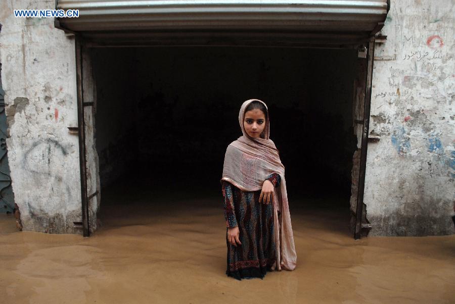 A girl stands in a flooded area in northwest Pakistan's Peshawar on July 26, 2015. At least 43 people were killed, hundreds of others injured and tens of thousands displaced in flooding and rain-related accidents in Pakistan's Punjab, Khyber Pakhtunkhwa and Balochistan, local media and officials said Saturday. (Xinhua/Umar Qayyum)