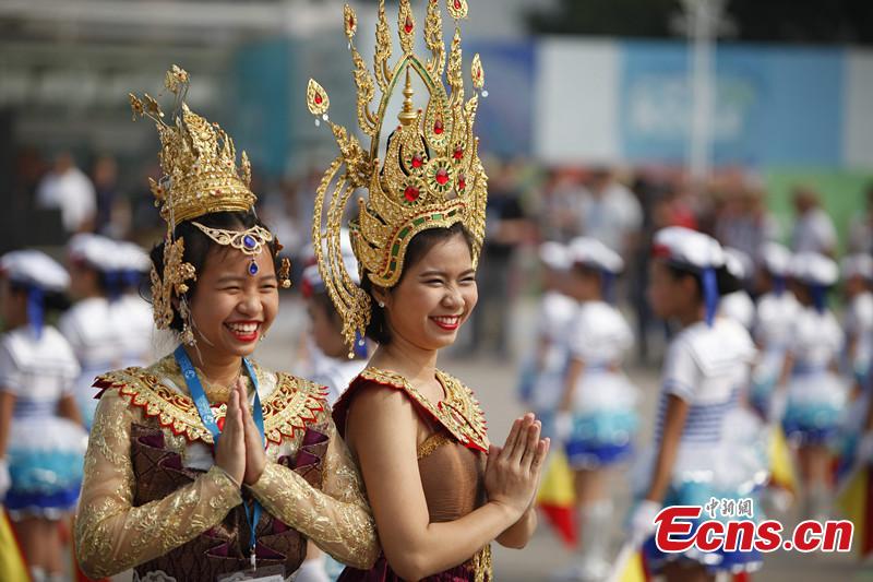 | Girls from Thailand attend the opening ceremony of 2015 Tianjin International Youth Cultural Art Festival in Tianjin, north China, July 26, 2015. More than 2,000 teens from 60 countries and regions took part in the festival that kicked off on Sunday. (CNS photo/Tong Yu) |
