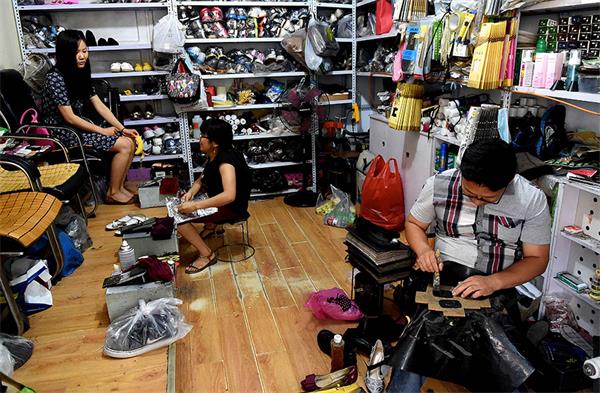 Cai chats with a client while Hu fixes shoes at their shop in Zhengzhou, Central China's Henan province, July 26, 2015.