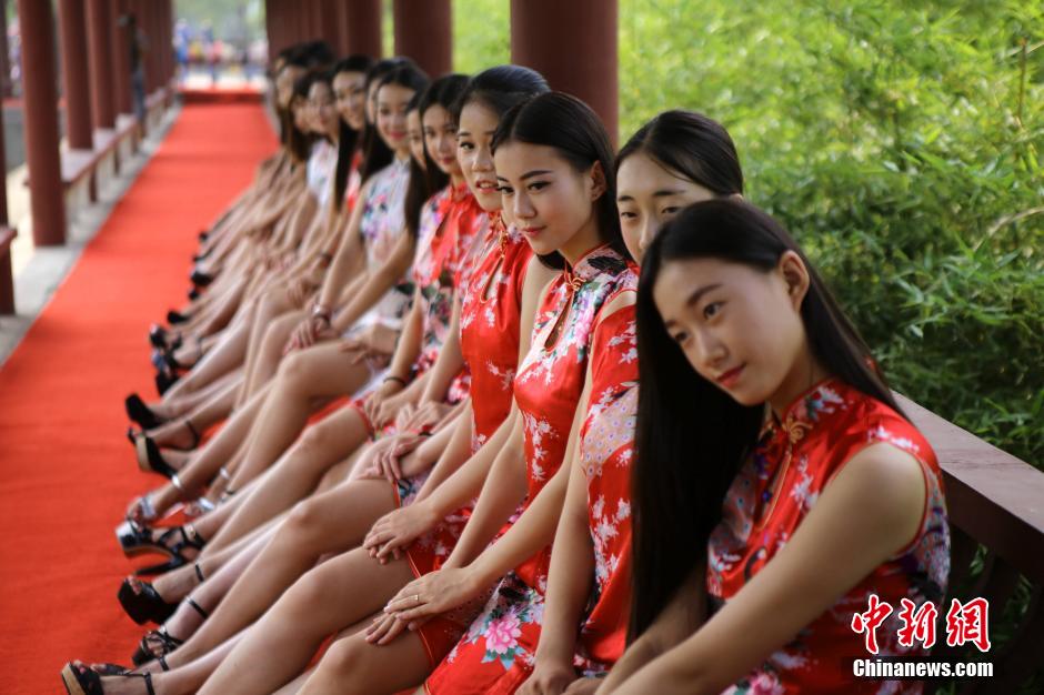 Contestants for this year's Miss Bikini Universe Henan Final show their beautiful long legs in cheongsam at a villa in Dengfeng city, central China's Henan Province, July 25, 2015. (CNS/Wang Zhongju)