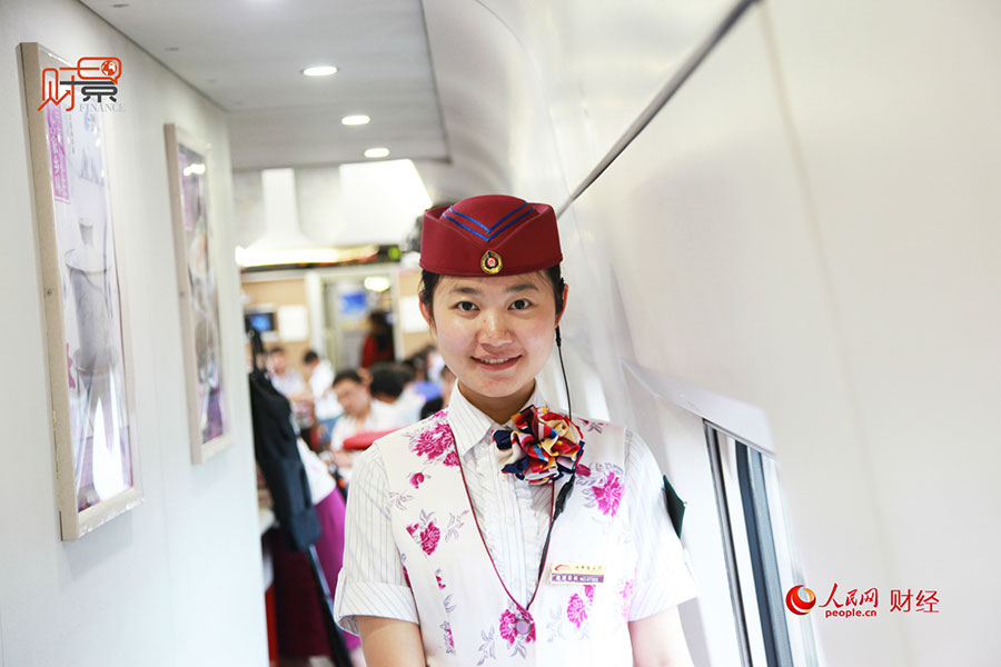 Zhou Ying, 24, is from Chengdu city, southwest China's Sichuan province. She graduated from Sichuan Normal University majoring in journalism. She accepts training in rotation on G307 high-speed train. (Photo/People's Daily Online)