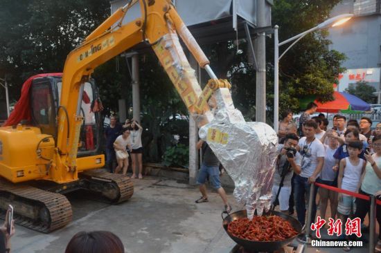 The one-month Crawfish Festival closes in Changsha on July 25, 2015. A 2.5 meter high excavator fried 800 crawfish for 14 netizens and 10 live diners, which attracted many onlookers.