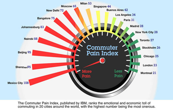 In IBM's 2011 Global Commuter Pain Survey, Beijing was named the city with the worst commuting conditions in the world, according to online magazine Smartplanet. Metropolises such as New York, Paris or Los Angeles, didn't even make the top 10.