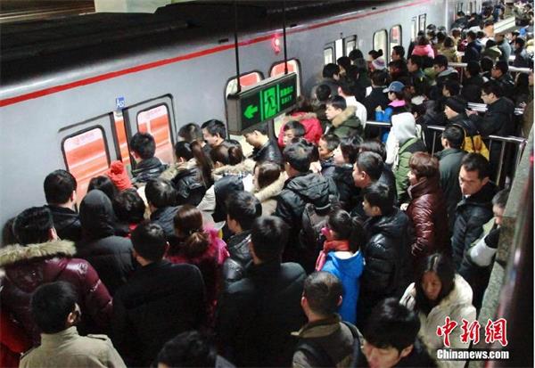 Commuters rush to get on the train in Beijing. [Photo/Chinanews.com]
