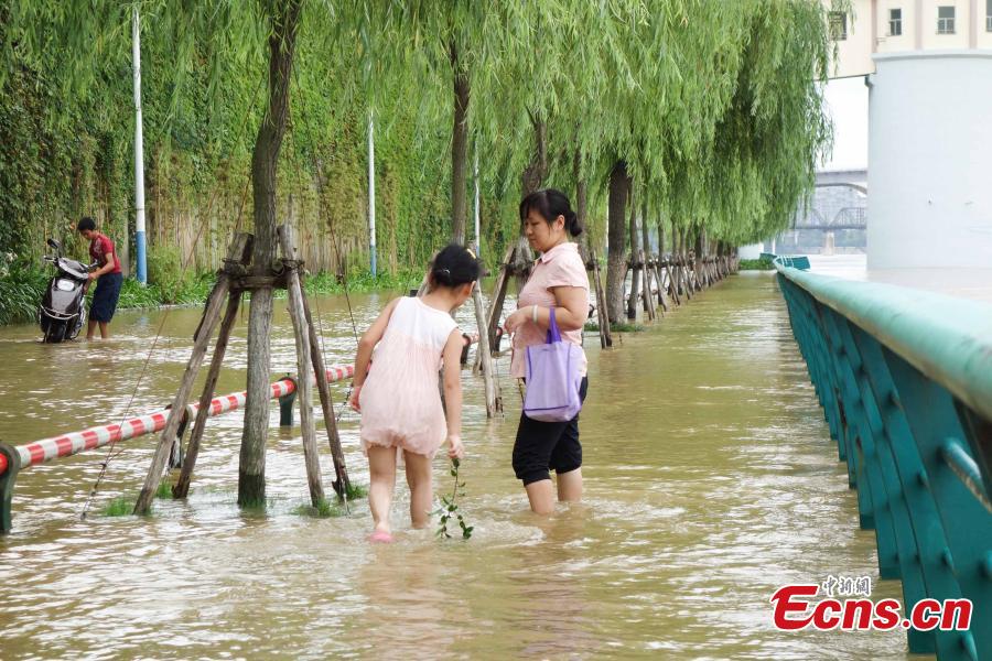 Pedestrians brave floodwater on a road in Liuzhou city, Southwest China’s Guangxi Zhuang autonomous region, July 28, 2015. Rainstorms and floods have affected 262,700 people in Guangxi and 12,700 have been evacuated to safety, a local source says. (Photo: China News Service/Huang Weiming)