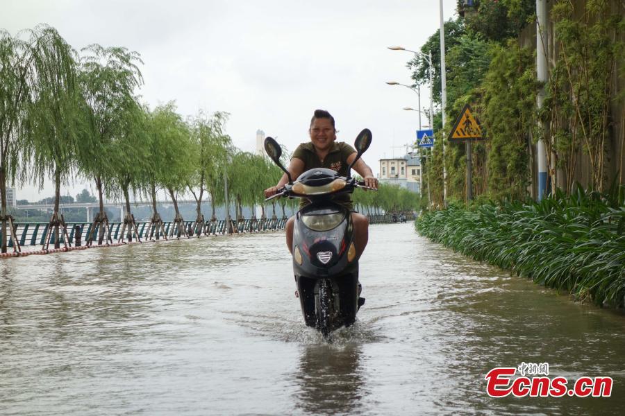 A woman riding a motorcycle braves a flooded road after rainstorms in Liuzhou city, Southwest China’s Guangxi Zhuang autonomous region, July 28, 2015. Rainstorms and floods have affected 262,700 people in Guangxi and 12,700 have been evacuated to safety, a local source says. (Photo: China News Service/Huang Weiming)