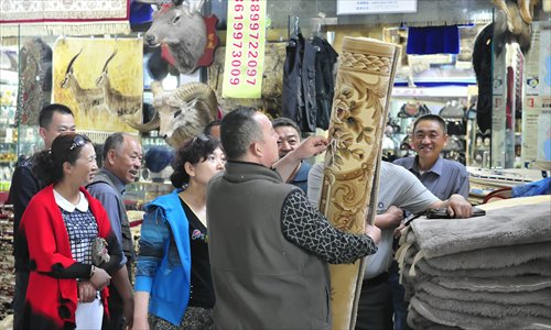Tourists from Qingdao, Shandong Province check Abdullah's carpets. Photo: Yu Lei