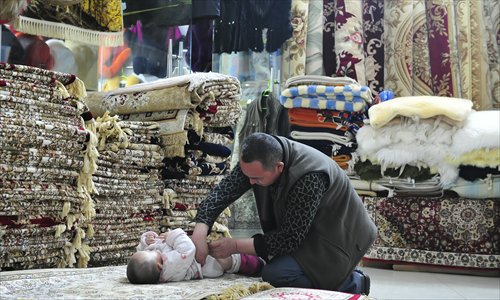 Abdullah changes his younger daughter's diaper in his shop. Photo: Yu Lei