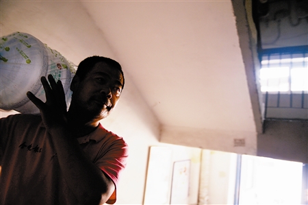When Li rushes to the community, he found that the elevator is out of order. He has to climb the stairs carrying the pail of water on his shoulder to the ninth floor.(Photo/Tonight News Paper)