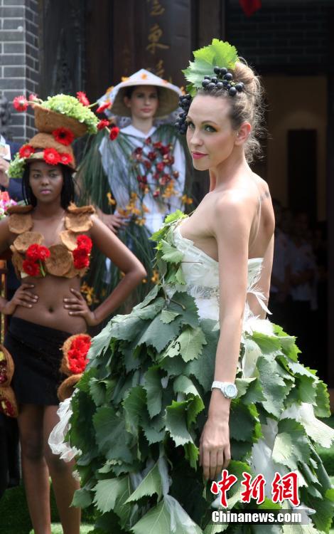 | Models stage a green fashion show in Ningxiang county, central China's Hunan province, July 25, 2015. Maria, a Russian green fashion designer, held a creative fashion show themed on nature with fruits and vegetables. (CNS/Deng Xia) |