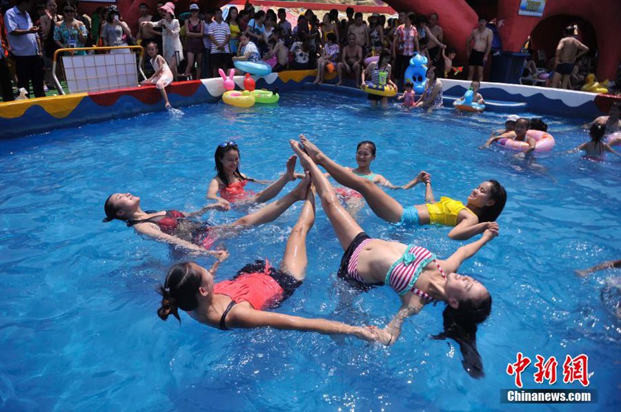 Yoga practitioners demonstrate movements in water in a water park in Chongqing on July 27, 2015. The highest temperature approached 40 degrees Celsius that day. (CNS/ Chen Chao)