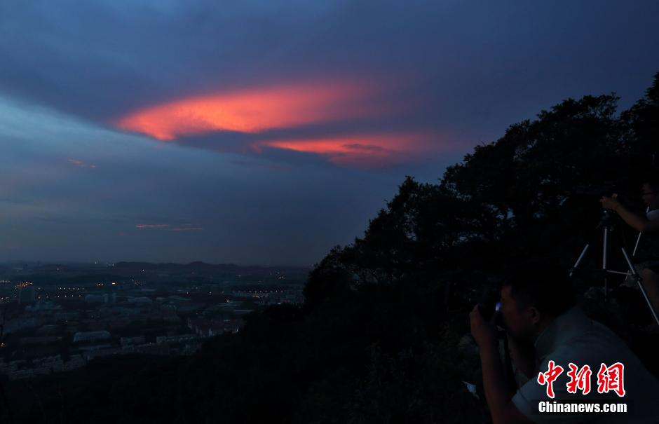 Gorgeous sunset glow appears in the sky over Nanjing city toward the evening of July 27, 2015. The red glow broke through the clouds just like a giant natural neon lamp. (Photo by China News Agency/ Fang Dongxu)