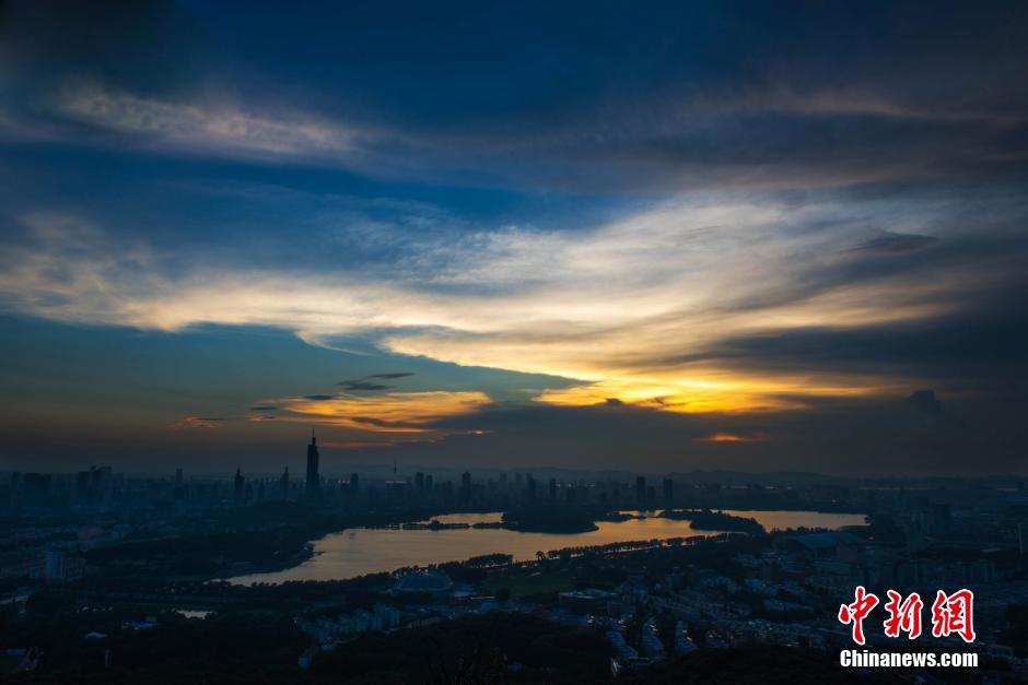 Gorgeous sunset glow appears in the sky over Nanjing city toward the evening of July 27, 2015. The red glow broke through the clouds just like a giant natural neon lamp. (Photo by China News Agency/ Fang Dongxu)