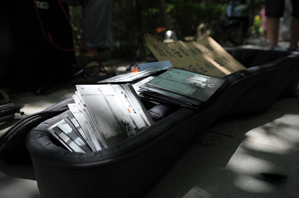 Liu always carries the first CD he made all by himself with him. Sometimes he also sells his own CDs while playing guitar in the street. (Qingdao News/Sun Zhiwen, Yu Hong)