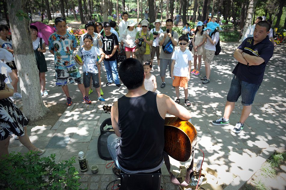 Liu sings in the street. (Qingdao News/Sun Zhiwen, Yu Hong)