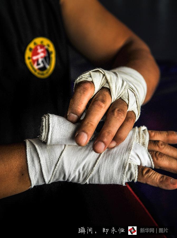 Chen Ming binds his hands with a band. (Photo/ Xinhua)