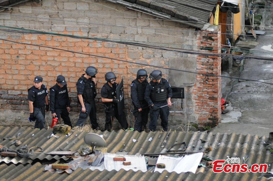 A special police team prepares to storm a room where a man has taken a woman hostage in Liuzhou city, Southwest China’s Guangxi Zhuang autonomous region, July 28, 2015. Three people, including two police officers, were injured after the five-hour standoff ended. (Photo: China News Service/Huang Weiming)