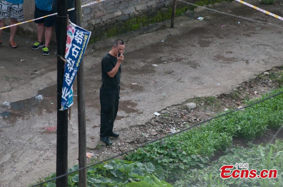 A police officer works near a room where a man has taken a woman hostage in Liuzhou city, Southwest China’s Guangxi Zhuang autonomous region, July 28, 2015. Three people, including two police officers, were injured after the five-hour standoff ended. (Photo: China News Service/Huang Weiming)