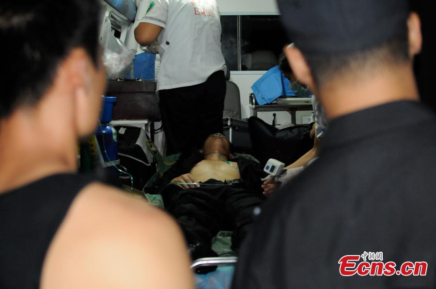 A police officer, who was injured in a hostage taking, is carried into an ambulance in Liuzhou city, Southwest China’s Guangxi Zhuang autonomous region, July 28, 2015. Three people, including two police officers, were injured after the five-hour standoff ended. (Photo: China News Service/Huang Weiming)
