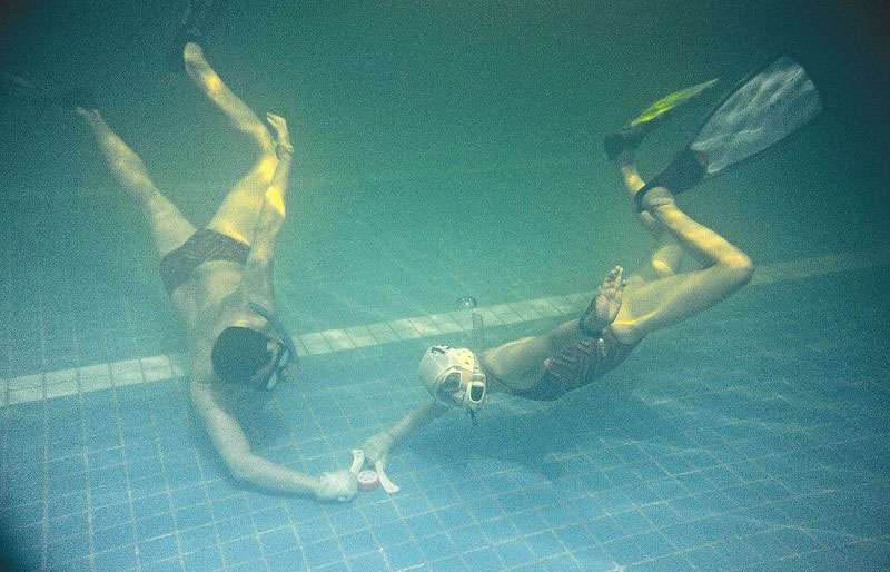 Two people play underwater hockey in Chengdu, capital of southwest China’s Sichuan Province. (Sichuan Daily/Xiao Yuyang)