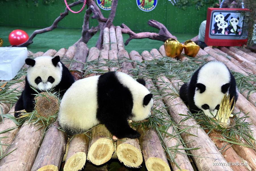 Giant panda triplets enjoy bamboo shoots during their birthday party for turning one year old at Chimelong Safari Park in Guangzhou, south China's Guangdong Province, July 29, 2015. (Xinhua/Liu Dawei)