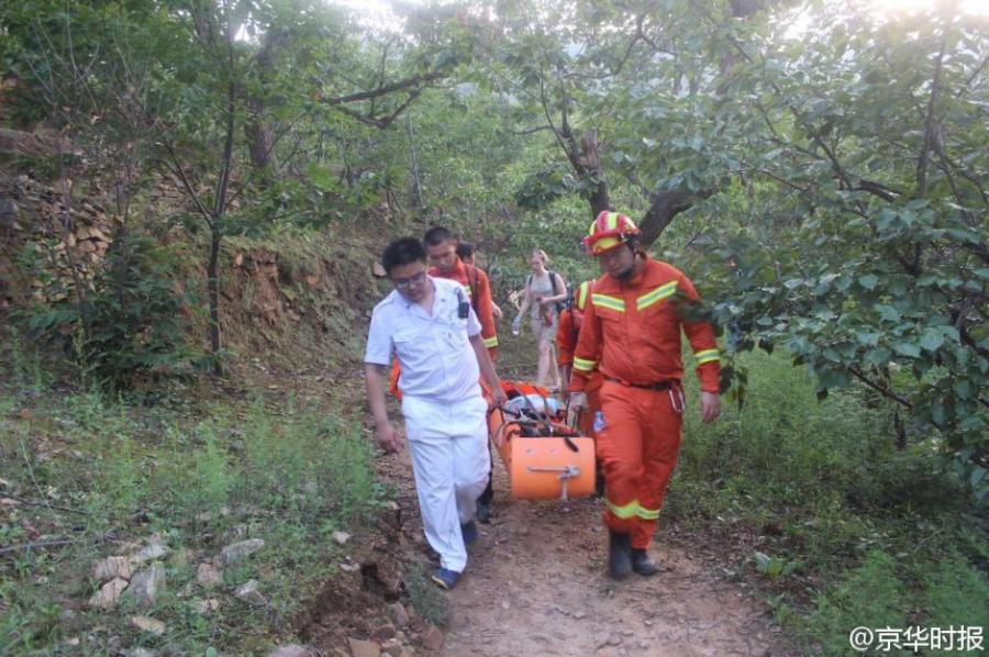 Rescuers help a South Korean tourist, injured after falling from an old, five-meter-tall watchtower on a hill in Huairou district, Beijing, July 29, 2015. Three Poland visitors found the injured woman and helped contact police for help. The South Korean tourist suffered fractures in her left arm. (Photo/Weibo of Beijing Times)