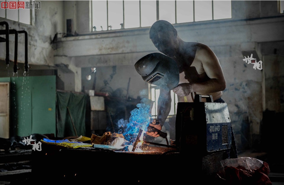 A worker welds the hook used for transferring ice. (China.com.cn/Lai Xinlin)