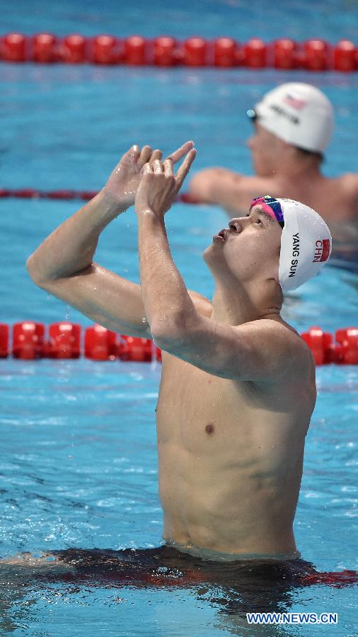 Sun Yang of China celebrates after winning the men's 400m freestyle swimming final at FINA World Championships in Kazan, Russia, Aug. 2, 2015. Sun Yang claimed the title of the event in a time of 3 minutes and 42.58 seconds. (Xinhua/Dai Tianfang)