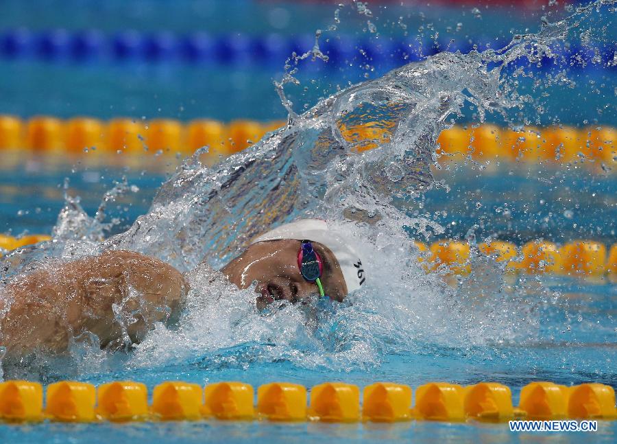 Sun Yang of China competes during the men's 400m freestyle swimming final at FINA World Championships in Kazan, Russia, Aug. 2, 2015. Sun Yang claimed the title of the event in a time of 3 minutes and 42.58 seconds. (Xinhua/Meng Yongmin)