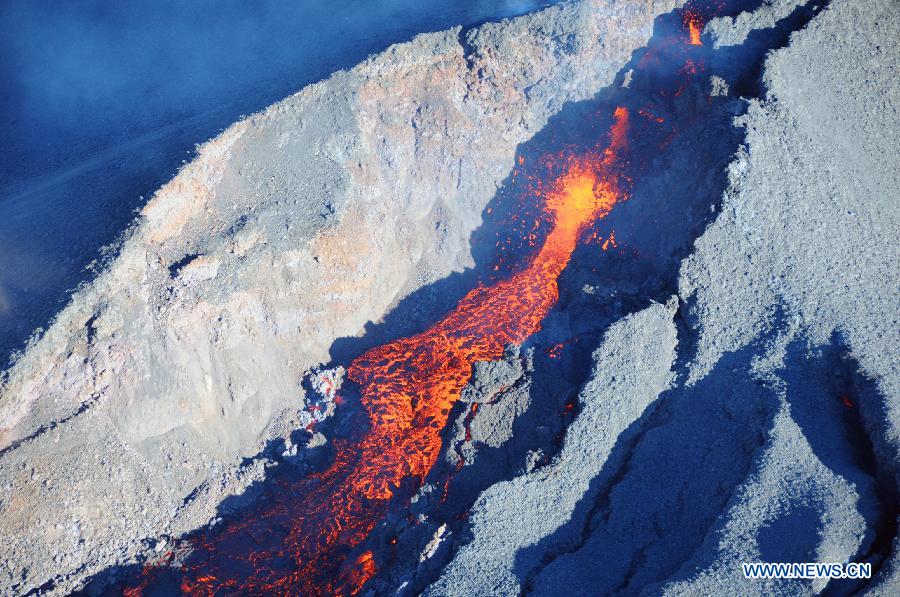 Photo taken on Aug. 1, 2015 shows the erupted Furnace Volcano in French overseas island La Reunion. The volcano is currently one of the most active volcanoes in the world. (Xinhua/Zhang Chuanshi)