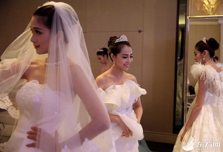 Sixteen Chinese contestants for 2015 Miss Universe 2015 pageant present bridal dresses for a high-end custom wedding show held in Shanghai Shangri-La Hotel on Aug. 3, 2015. (Photo/ eastday.com)