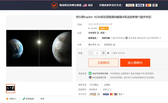 After NASA announced its discovery of the new exo-planet Kepler-452b, a listing has popped up on Chinese e-commerce site TaoBao which offers an "immigration status ticket" for migration to the potentially habitable planet, 1,400 light years away for a mere 0.2 yuan, or about $0.03.