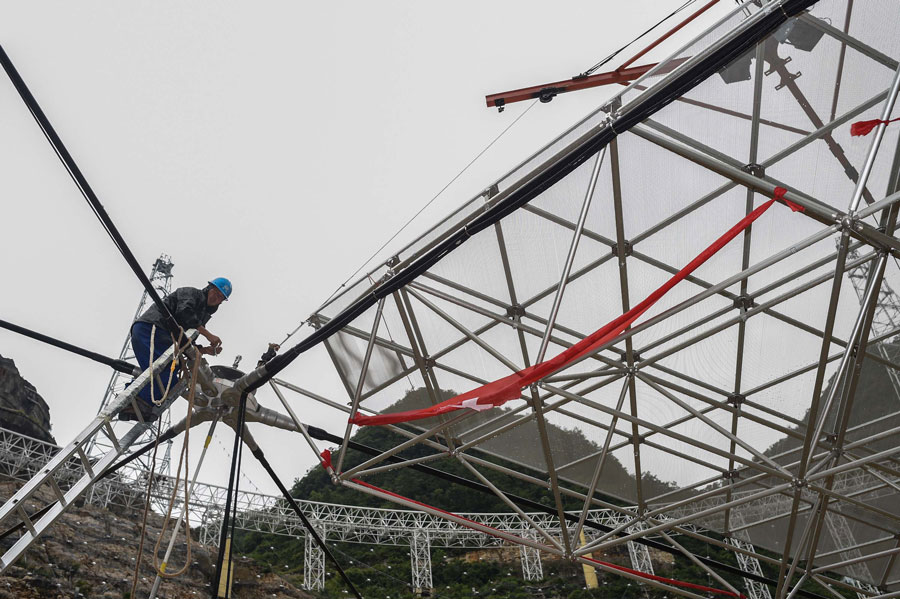 | Photo shows the assembly site of the single-aperture spherical telescope "FAST" in Qiannan of southwest China's Guizhou Province. (PhotoXinhua) |