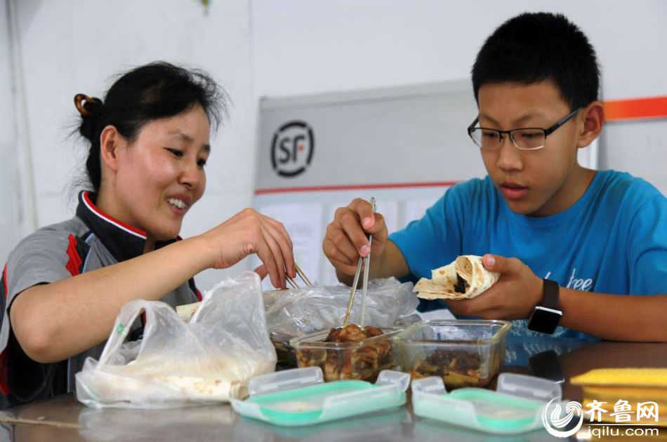 Her son comes to the express service station to have lunch with her at noon. (Photo/iqilu.com)