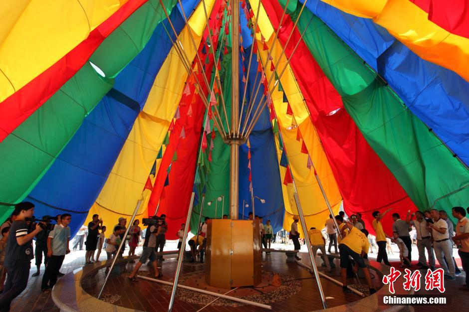 The global biggest sun-and-rain-proof umbrella is slowly unfolding. (Photo by Wei Dongcheng / Chinanews)