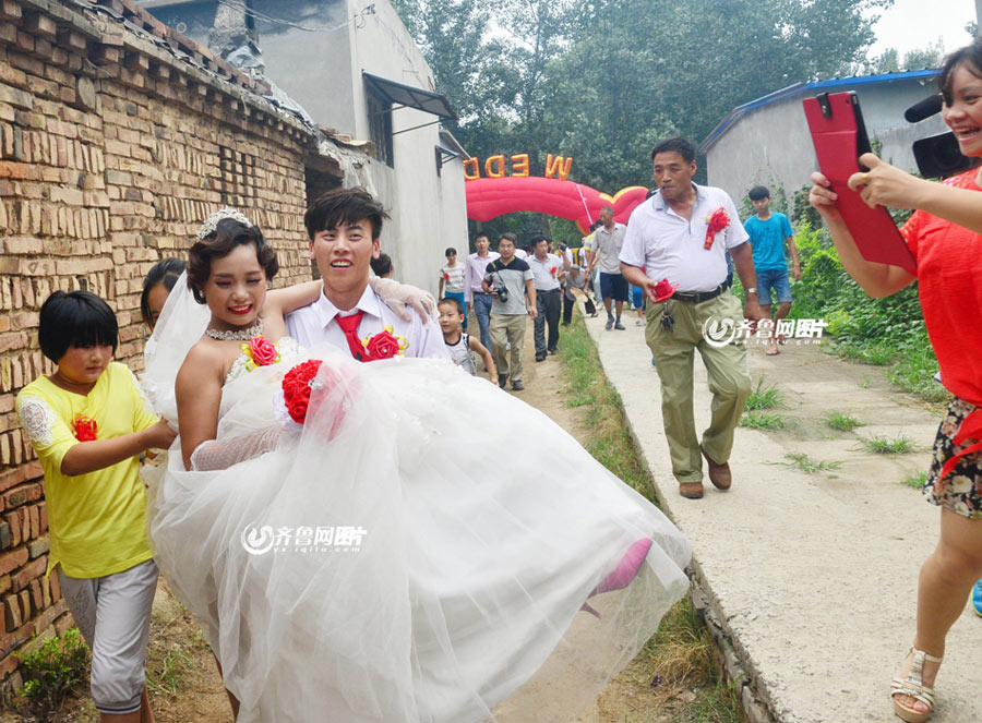 Cycling enthusiast Liu Zhaohui, accompanied by over 60 friends from his cycling club, rides 26 km to fetch his bride Zhang Ningning in Liaocheng, east China’s Shandong province on Aug. 3, 2015. The couple got acquainted in the cycling club, and they chose to have a “low carbon wedding” through riding. (Photo/iqilu.com)