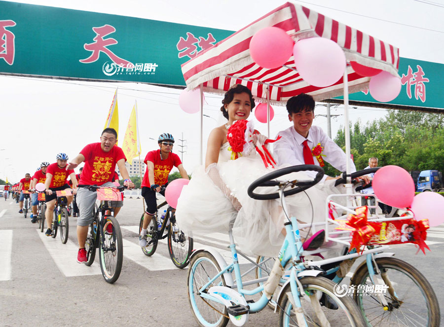 Cycling enthusiast Liu Zhaohui, accompanied by over 60 friends from his cycling club, rides 26 km to fetch his bride Zhang Ningning in Liaocheng, east China’s Shandong province on Aug. 3, 2015. The couple got acquainted in the cycling club, and they chose to have a “low carbon wedding” through riding. (Photo/iqilu.com)