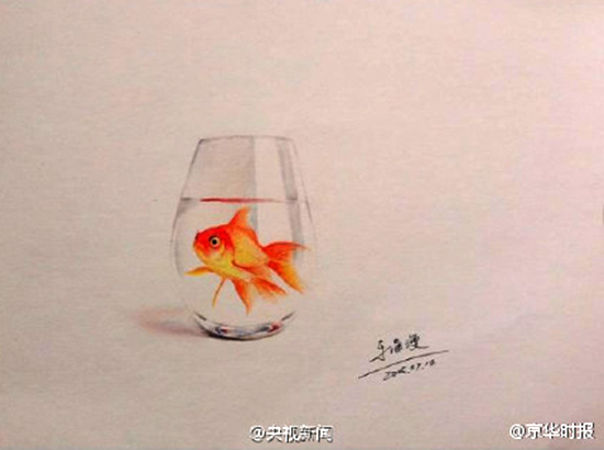 Young man draws vivid Goldfish with colored pencils (2)