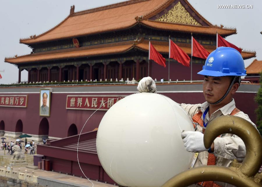 Workers clean and overhaul a lamp during the annual maintenance of city lamps near Tian'anmen Square, in Beijing, capital of China, July 6, 2015. (Xinhua/Gong Lei)
