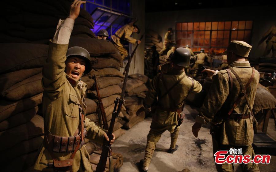 Sculptures demonstrate scenes from the defense of Sihang Warehouse in 1937 at a memorial site in Shanghai, Aug 5, 2015.