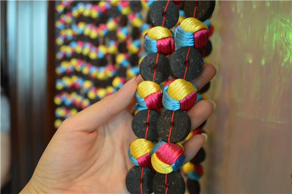 Compressed dark tea can also be made into artworks, such as the decoration in a special curtain. (Photo: chinadaily.com.cn/Jiang Wanjuan)