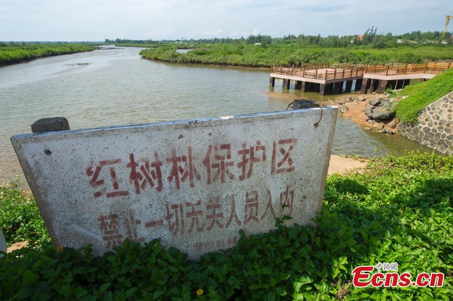 Warnings regarding the protection of mangrove wetlands are painted on a wall in Chengmai county, South China’s Hainan province, Aug 5, 2015.