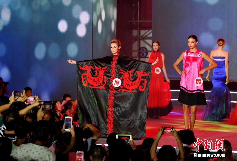 | Models show beautiful costumes of the Yi nationality on T stage. (Photo by China News Agency/ Liu Zhongjun) |