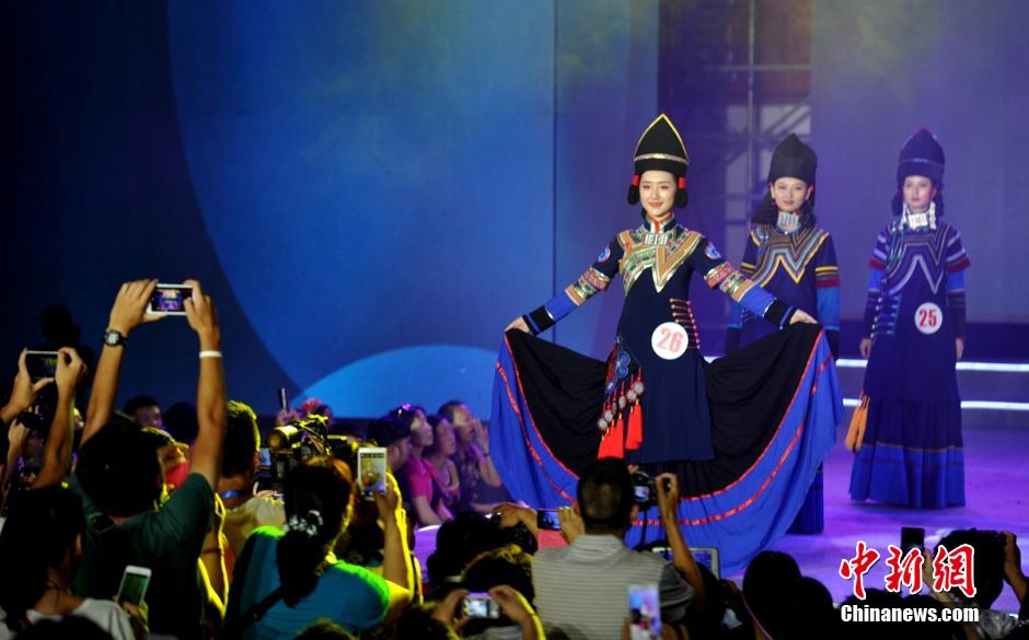 Models show beautiful costumes of the Yi nationality on T stage. (Photo by China News Agency/ Liu Zhongjun)