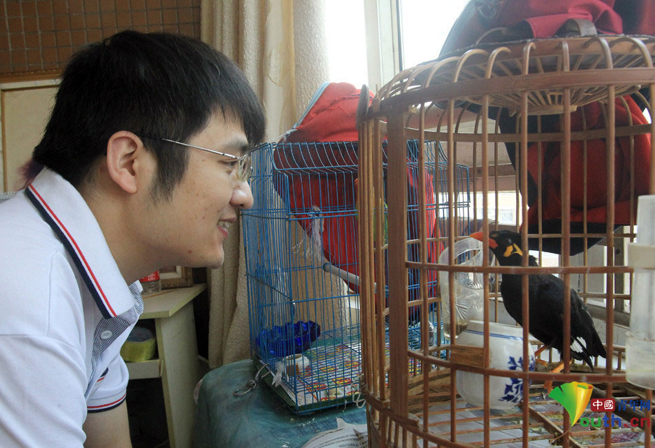 Weng Ning speaks to his friend - a myna - after the practice. (Photo/Youth.cn)