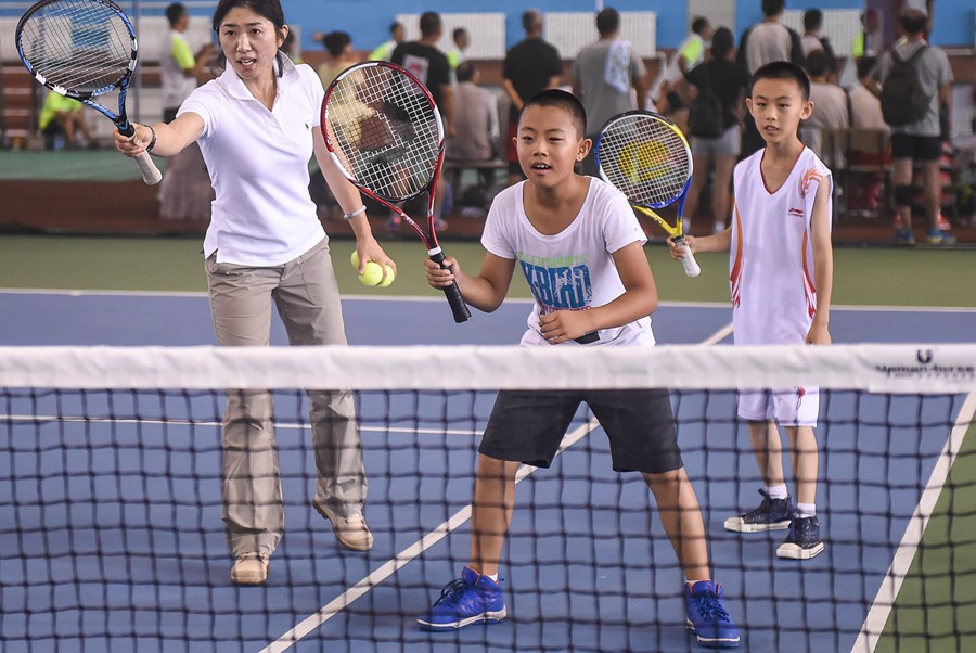 Children learn to play tennis at the sports summer camp on Aug. 5. (Photo/ Xinhua)