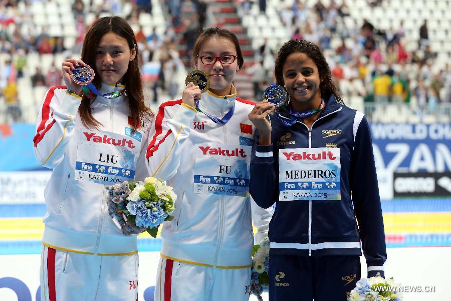 (From L to R) Silver medalist Etiene Medeiros of Brazil, gold medalist Fu Yuanhui of China and bronze medalist Liu Xiang of China pose during the awarding ceremony for the women's 50m backstroke final at the 2015 FINA World Championships in Kazan, Russia, Aug. 6, 2015.(Xinhua/Meng Yongmin)